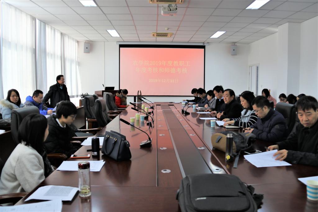 2019年12月31日,农学院召开2019年度考核工作会议。按照学校年度考核工作要求,学院全体教职工逐一发言,对个人年度教学、科研工作和师德师风建设情况进行了认真梳理,总结工作成绩,分析存在的问题,明确今后的整改措施。与会人员对每位教职工年度工作和师德师风情况进行了民主测评。