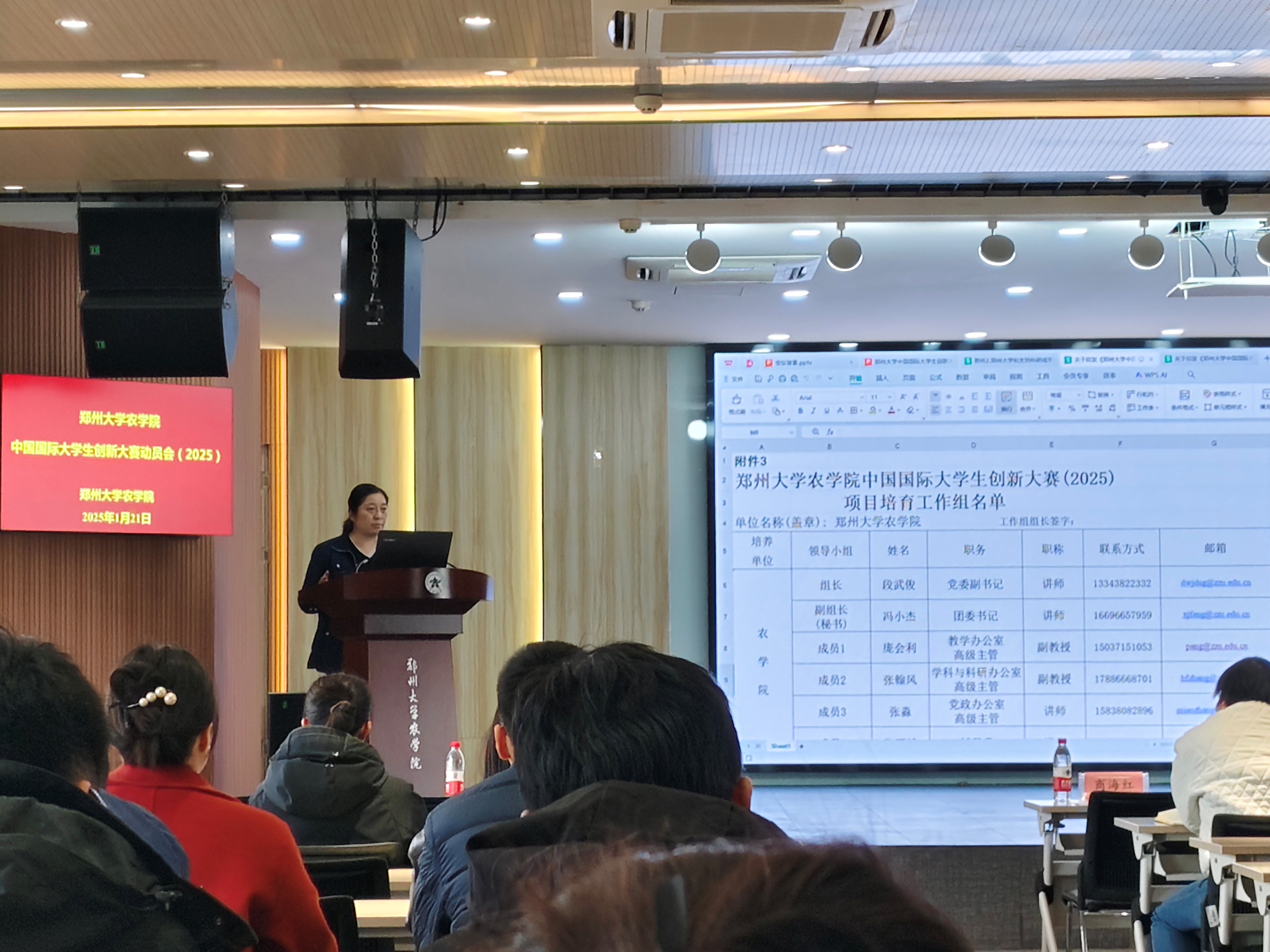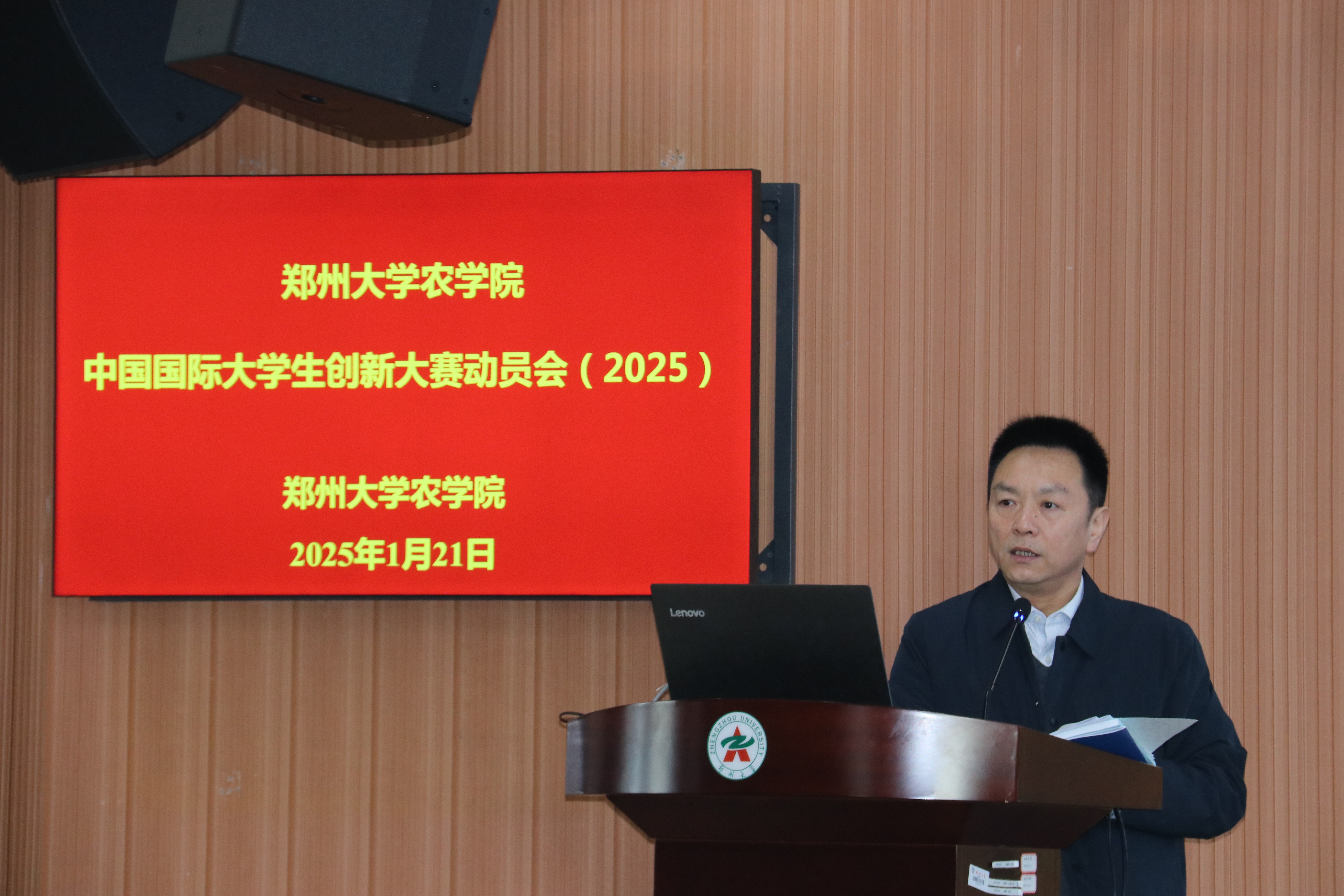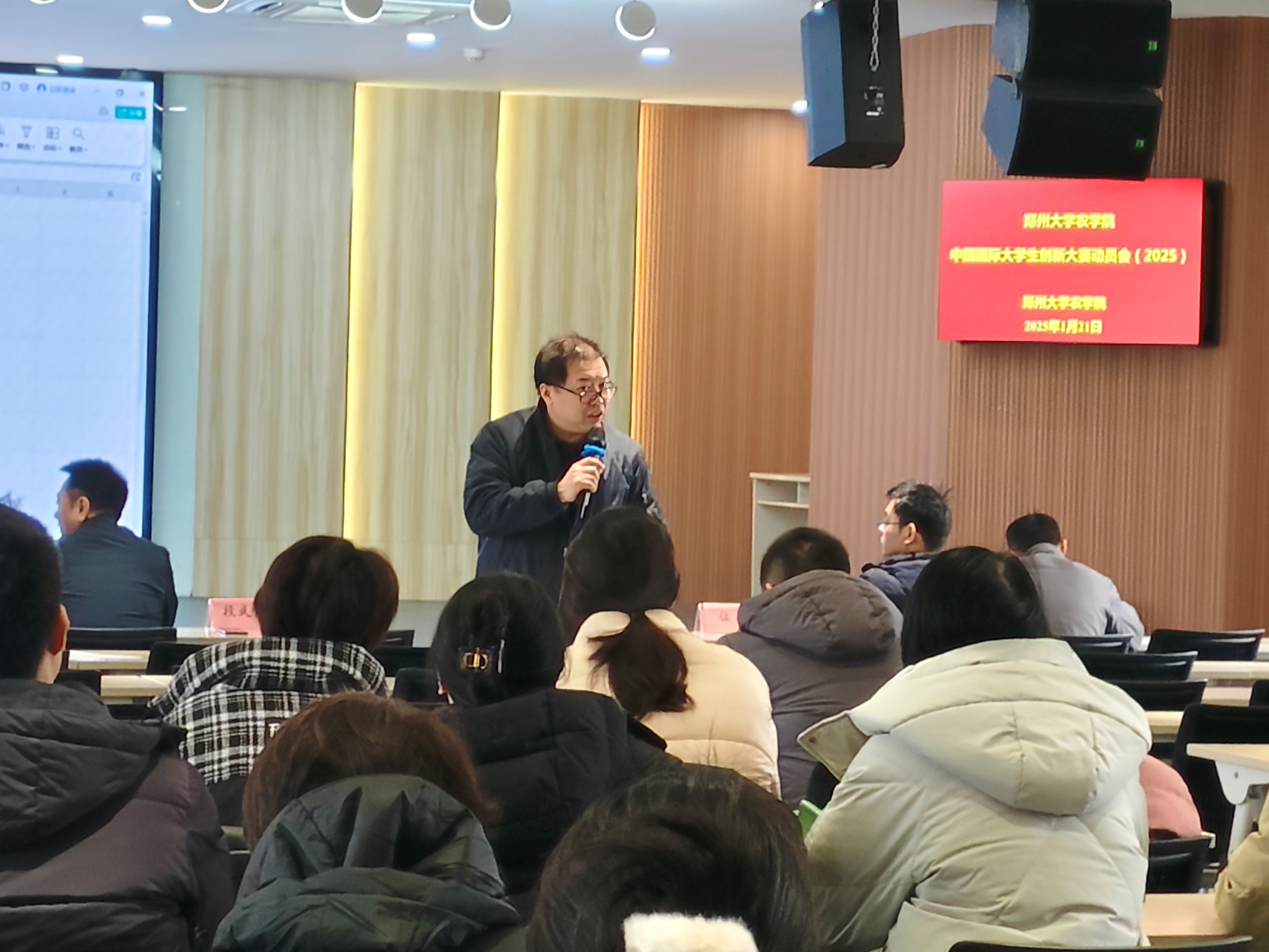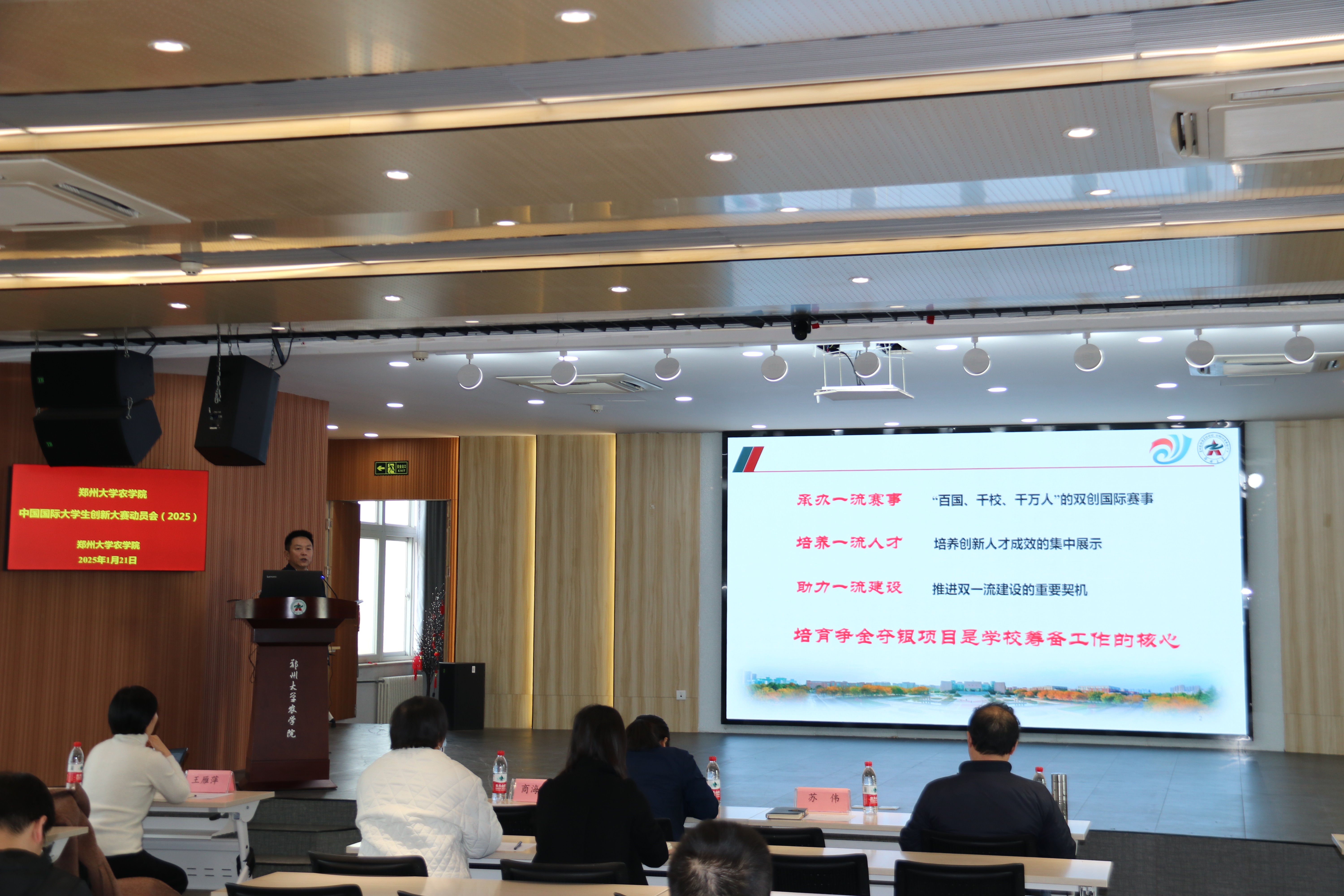 为积极响应习近平总书记给中国国际大学生创新大赛参赛学生代表的回信精神及全国教育大会精神,全力构建一流双创教育与应用型人才培养体系,郑州大学农学院于 1 月 21 日上午在 313 会议室隆重召开中国国际大学生创新大赛(2025)动员会。此次会议由学院党委书记苏伟、执行院长焦浈、党委副书记段武俊、副院长位芳、副院长王雁萍、副院长华营鹏、团委书记冯小杰及辅导员张亚敏、殷湘坤以及骨干教师等齐聚一堂,共同为大赛筹备工作谋篇布局,力促参赛项目质量提升。