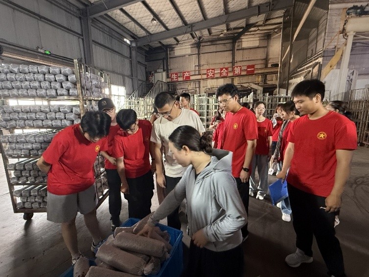 在河南金海生物科技有限公司,师生们依次参观了微生物发酵车间、菌种培养实验室和产品展示中心。公司依托食用菌生物技术,形成“研发—种植—加工—有机肥”闭环产业链,已创造200余个稳定岗位、季节性用工1500人,培训农民2200人次,精准帮扶11个行政村、带动5000余人增收。