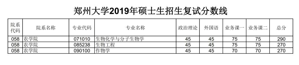 根据2019年全国硕士研究生初试成绩进入复试的理学国家线,我院生物化学与分子生物学专业(071010)的总分应为290分,特此说明。农学院2019年硕士生招生复试分数线以本公告和郑州大学研究生院网站发布为准。