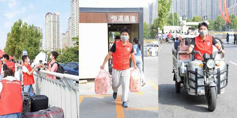 各岗同学负责测温、系统录入、核验信息、收发材料与行李搬运等任务,尽最大努力在每个环节为新生提供完善周到的服务。