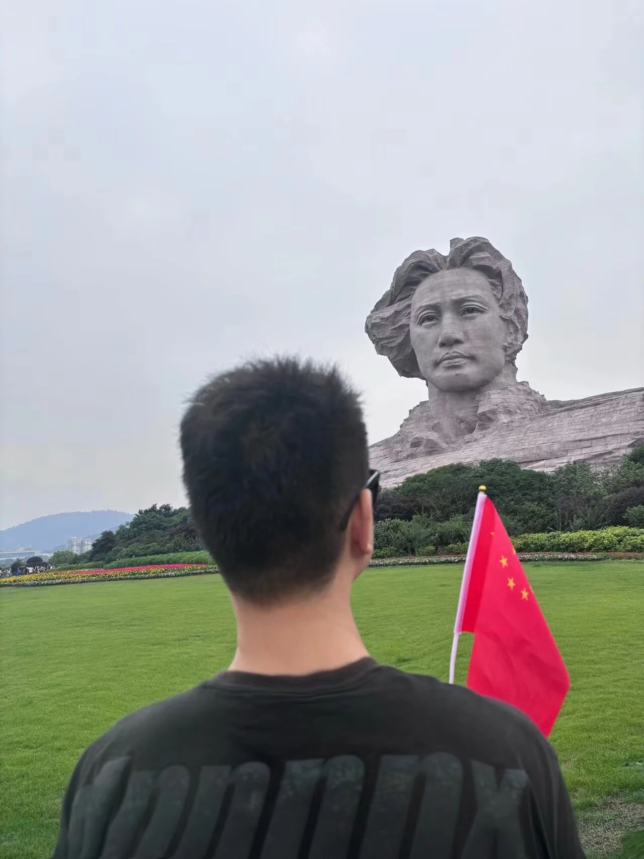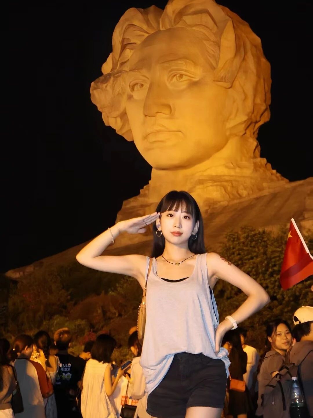 这幅摄影作品生动捕捉了一个充满自豪与激动的瞬间。画面中,鲜艳的红旗象征着祖国的力量与荣耀。长沙的橘子洲头像一颗镶嵌在湘江之畔的璀璨明珠。沿着江边漫步,微风轻拂,江水波光粼粼,仿佛诉说着这座城市的故事。最引人注目的当属毛主席的青年艺术雕塑,那坚定的眼神、伟岸的身姿,让人不禁心生敬意。站在雕像下,仿佛能感受到伟人当年的壮志豪情。秋天,枫叶渐红,又为这里增添了一抹诗意的浪漫。