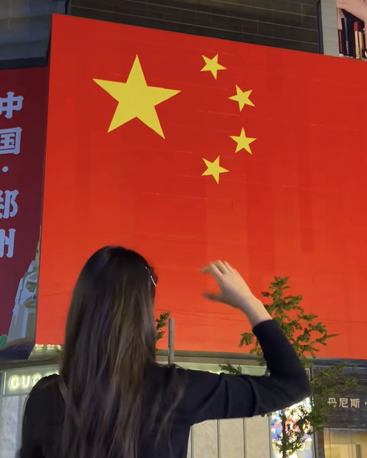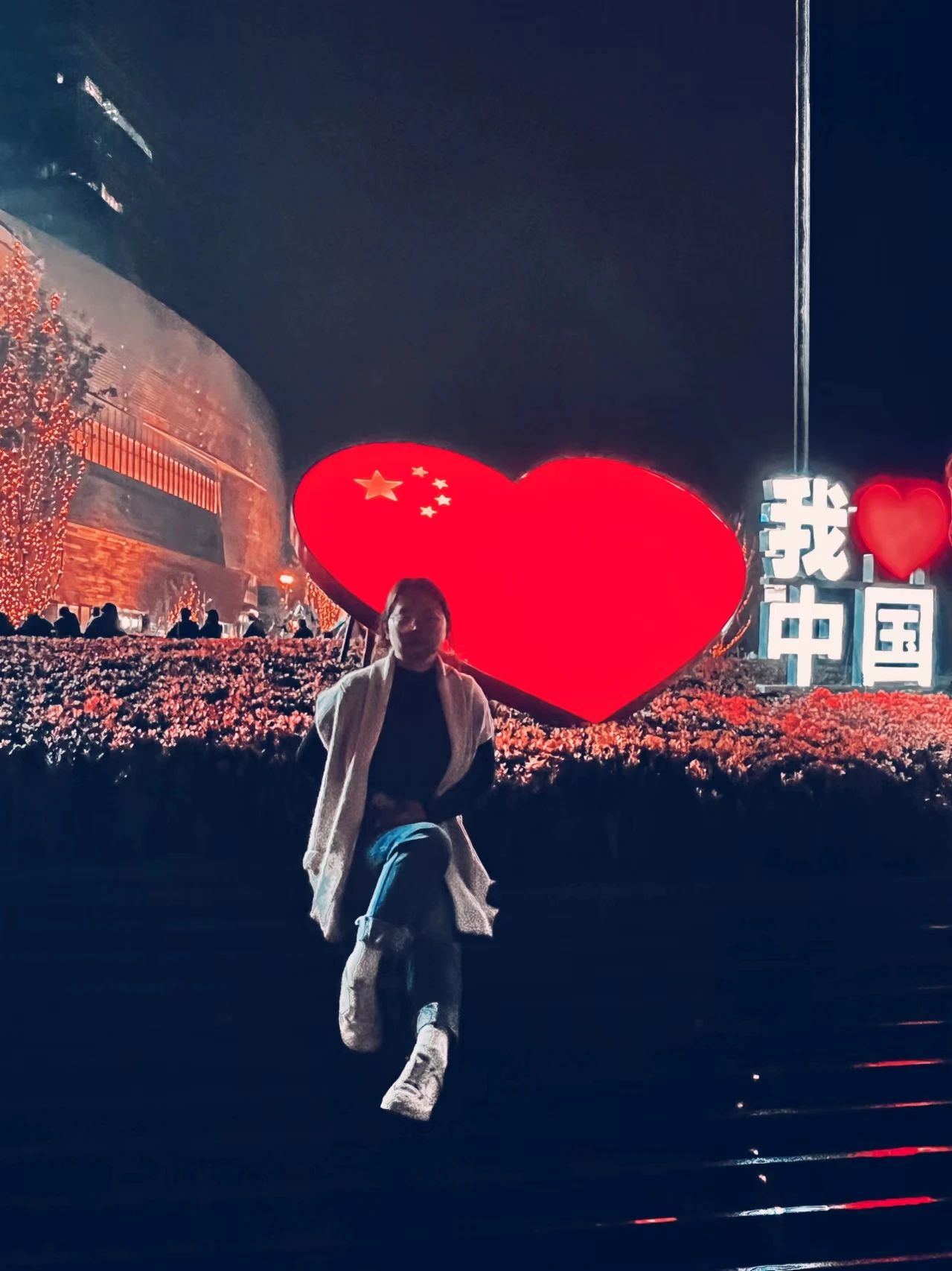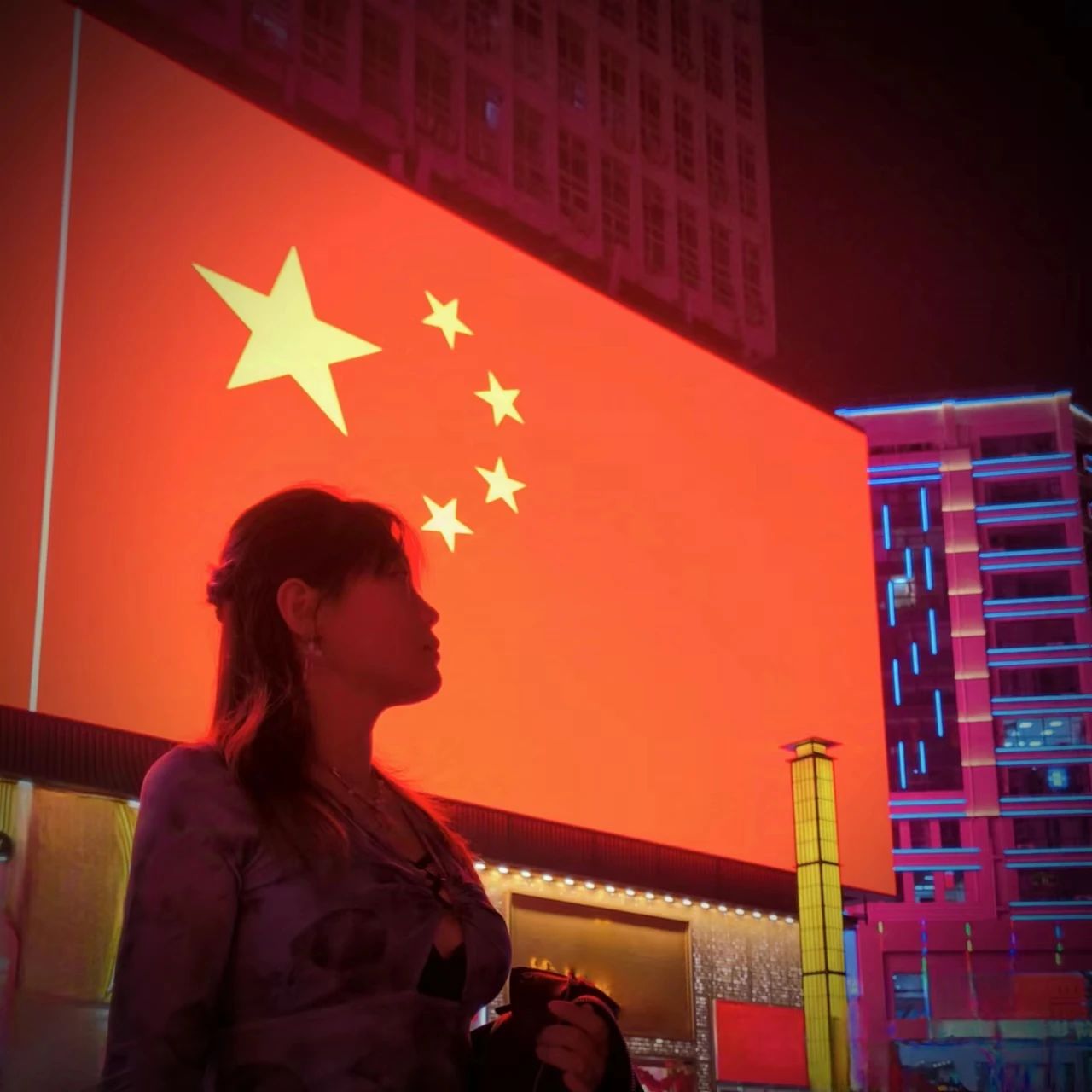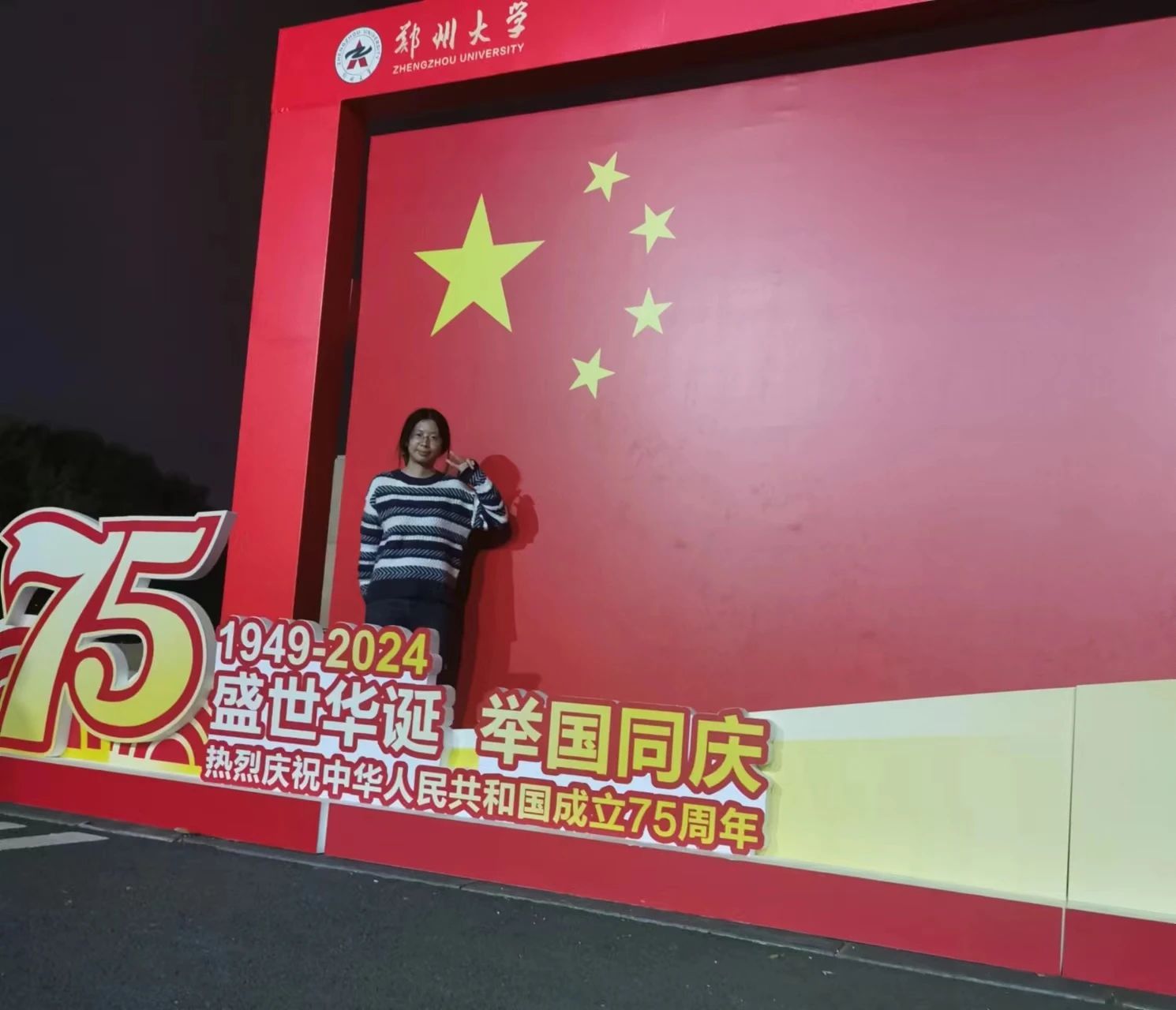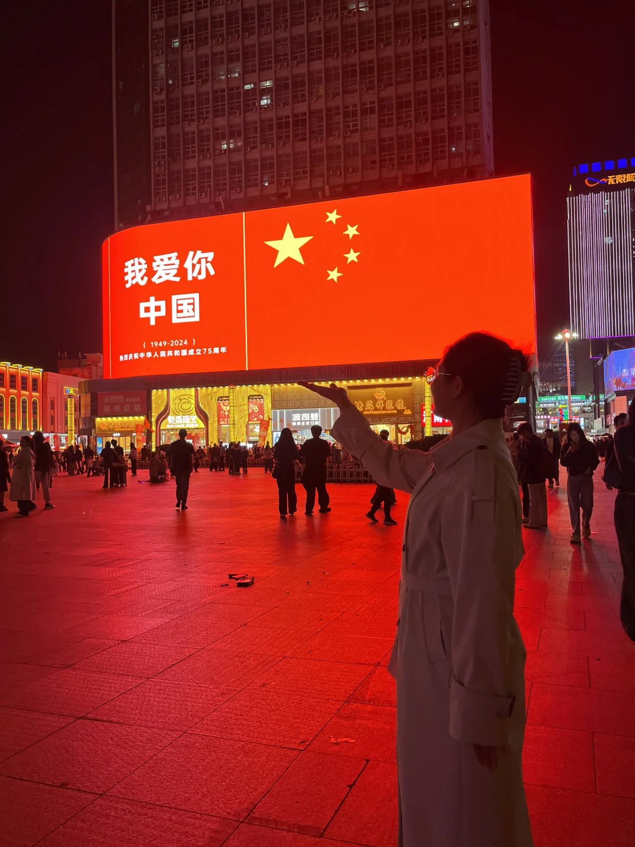 国庆节当晚,我来到二七纪念塔与国旗合影。二七纪念塔是为纪念1923年京汉铁路工人运动而修建的纪念性建筑物,京汉铁路工人运动是中国共产党领导的第一次工人运动高潮的顶点,正是无数先烈无畏地拼搏才有了现在的中国。此时此刻,大屏幕上的五星红旗格外明亮,照亮了夜晚的二七广场。