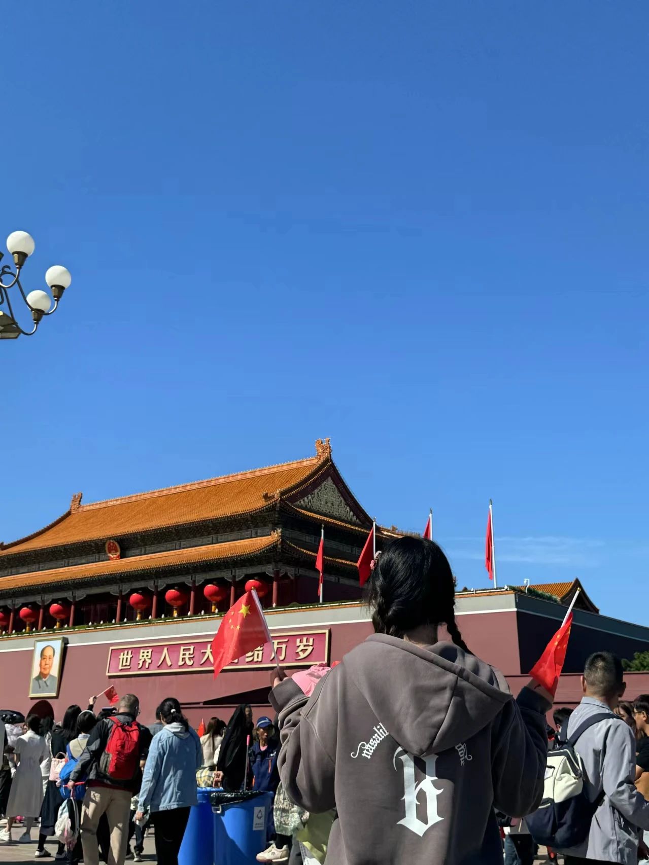 这幅照片是在故宫面前拍摄的,故宫这伟大的建筑是我们中国人民的骄傲,所以我想亲眼看看这“伟大的创作,并选择了在这拍一张合照来庆祝新中国成立第75周年。