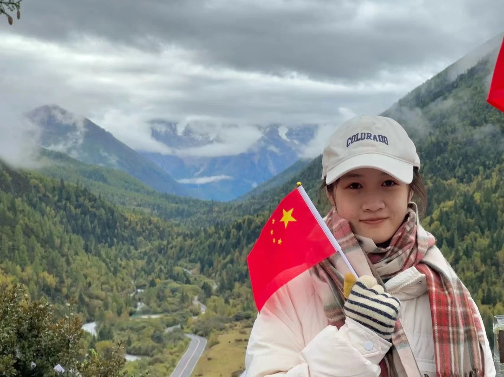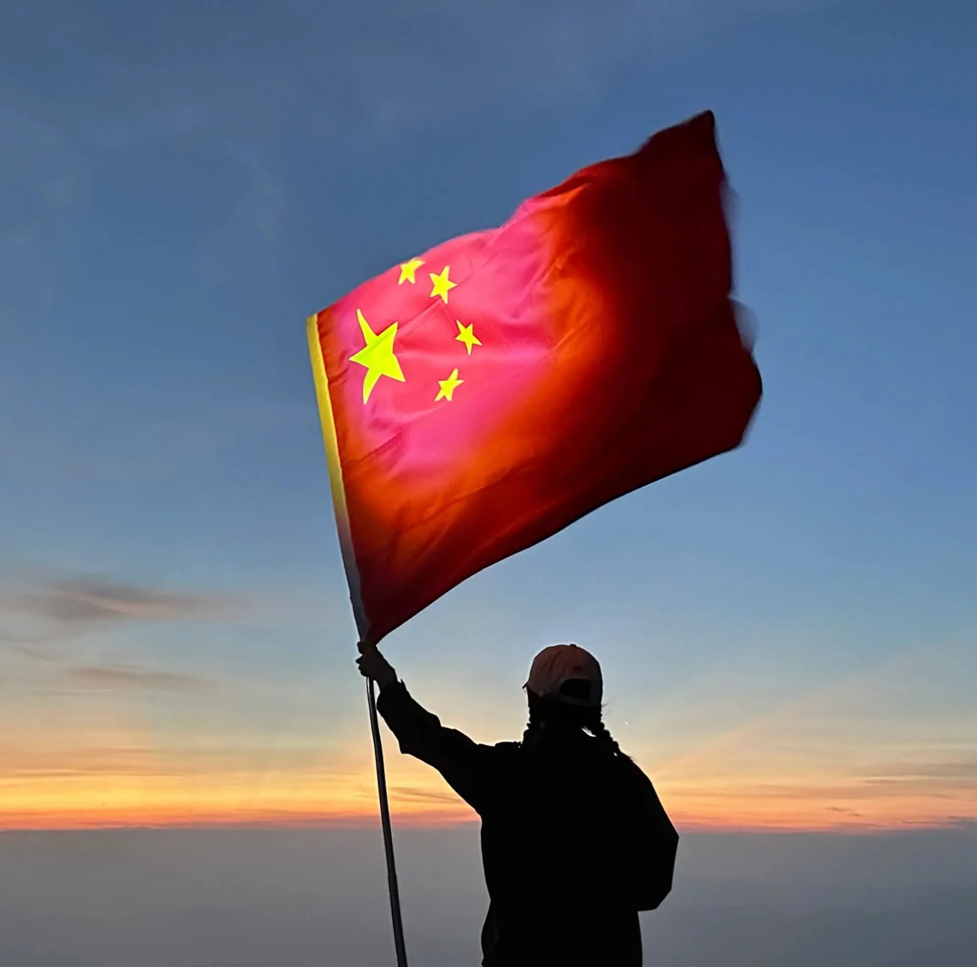 背景的雪山层次分明,云雾缭绕,增添了几分神秘与梦幻的色彩。右手举起一面鲜艳的五星红旗,旗帜在风中轻轻飘扬,不仅象征着对祖国的热爱与骄傲,也仿佛是连接人与自然、过去与未来的一座桥梁。这幅作品不仅是一幅风景照,更是一份情感的传递,它讲述着关于勇气、梦想、爱国情怀以及对大自然敬畏之心的故事。手中的五星红旗,成为了连接个人情感与国家荣耀的纽带,激励着每一个观看者心中那份对美好事物的向往与追求。