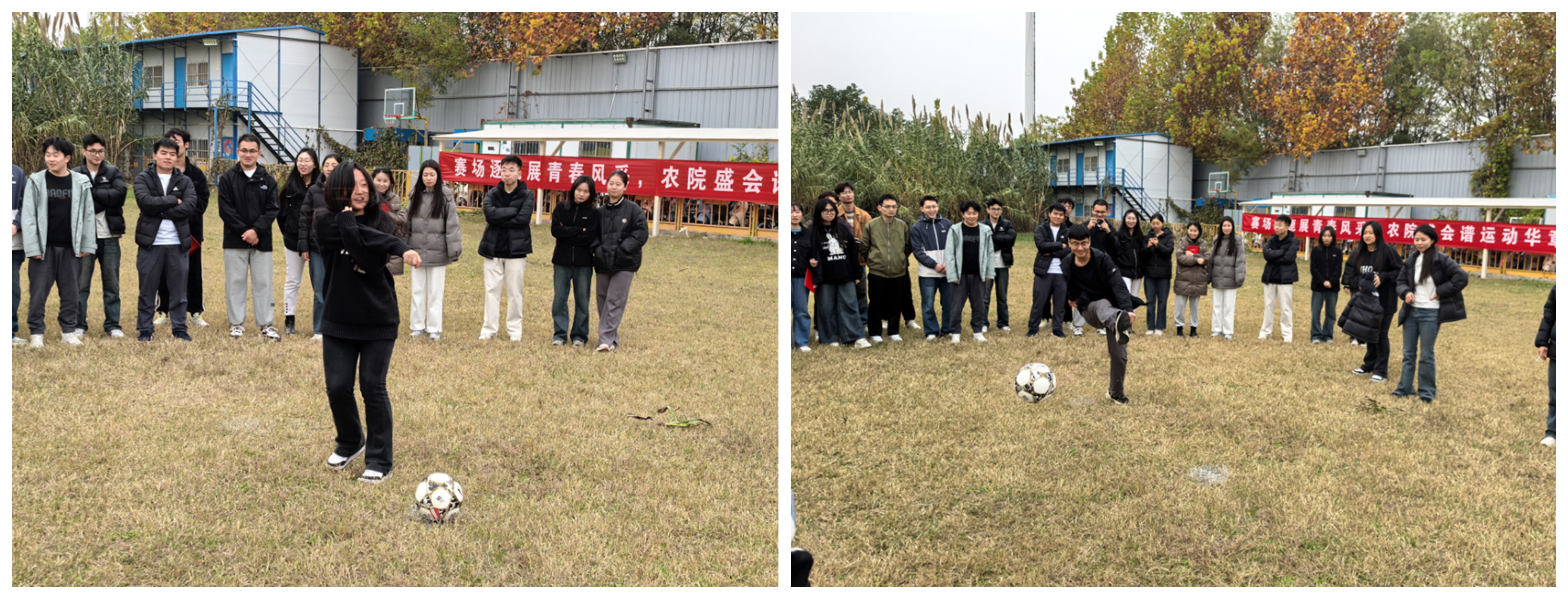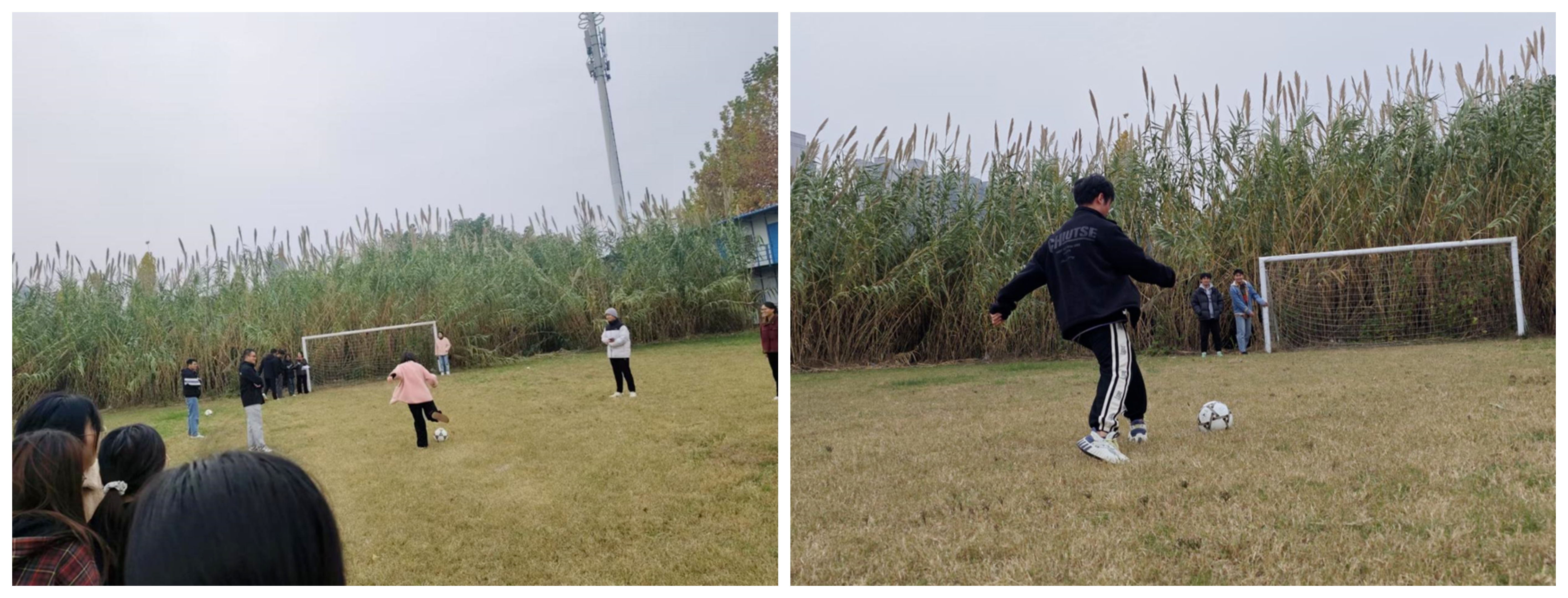 第二场比赛“旋转定点射门”。3位同学一组,参赛者原地大象转十圈后,须在10秒内将足球踢出。转圈后,运动员们努力克服眩晕感,寻找着最佳的发力点。一脚抽射,足球如离弦之箭,划破空气,直指球门。精彩瞬间纷呈,现场氛围热情洋溢。