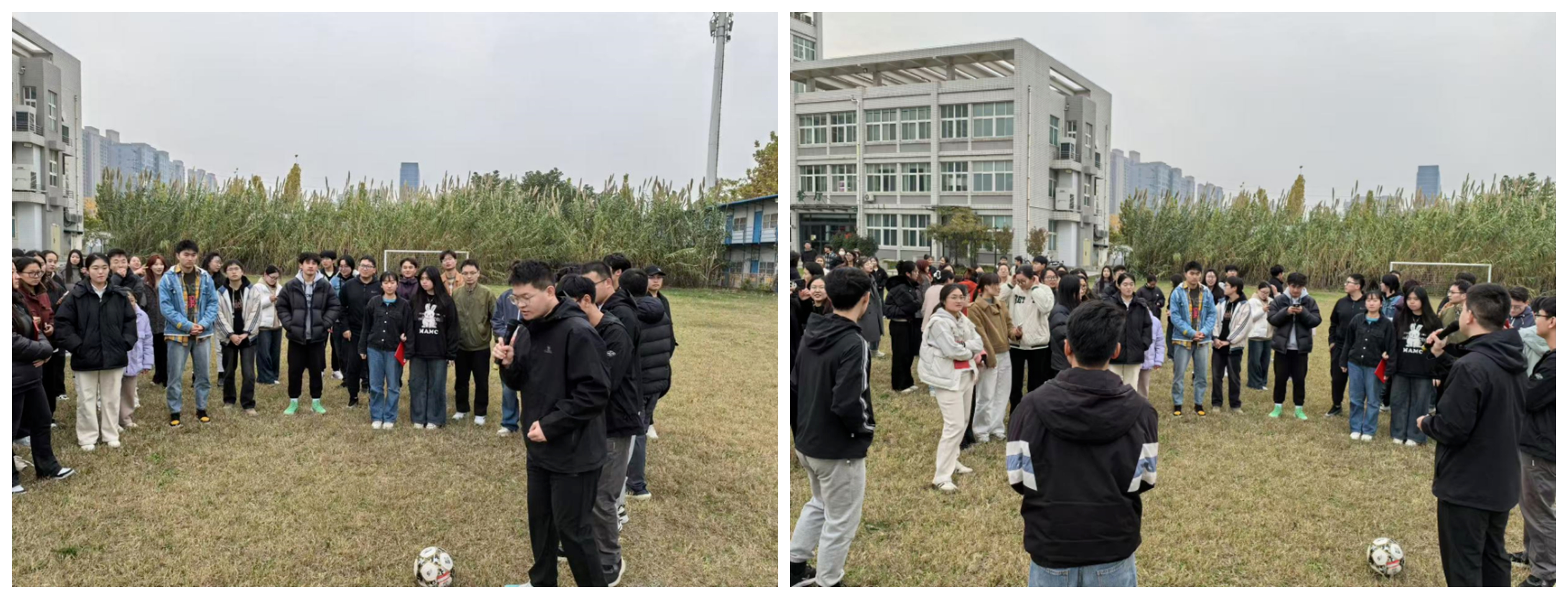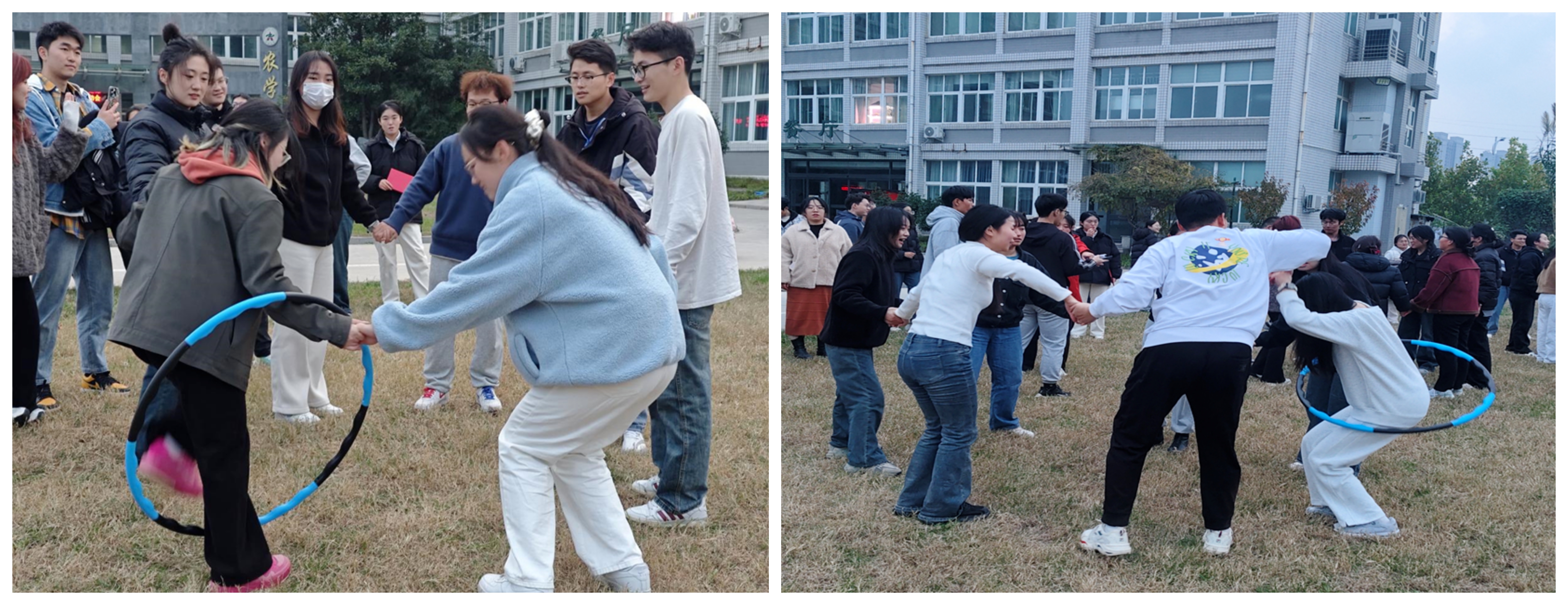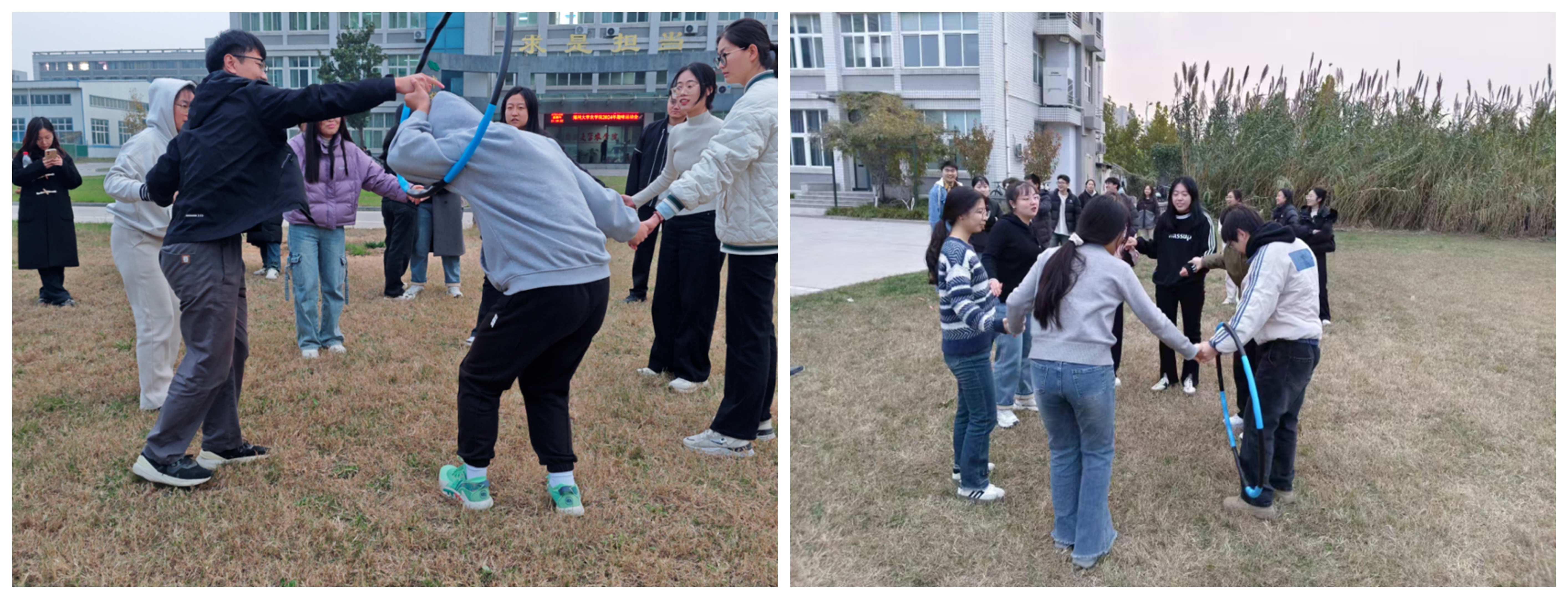 第三场、第四场比赛是团体项目,“气球接力”比赛,组内分6个2人小组,每2人小组的选手站在起跑线,两人背靠背站立,中间夹住一个已吹好的气球,沿着指定路线跑向下一组选手地点,选手全程需保持背靠背夹气球姿势,完成气球交接;“一圈到底”比赛,每队7人手拉手围成一圈,通过手臂传递呼啦圈,全员通过为完成一圈,用时最短的团队获胜。每一次默契的配合、每一声激昂的欢呼,汇成一股股暖流,驱散了秋风的微凉。同学们因对体育的热爱而欢聚,共同在赛场上书写着青春的篇章。