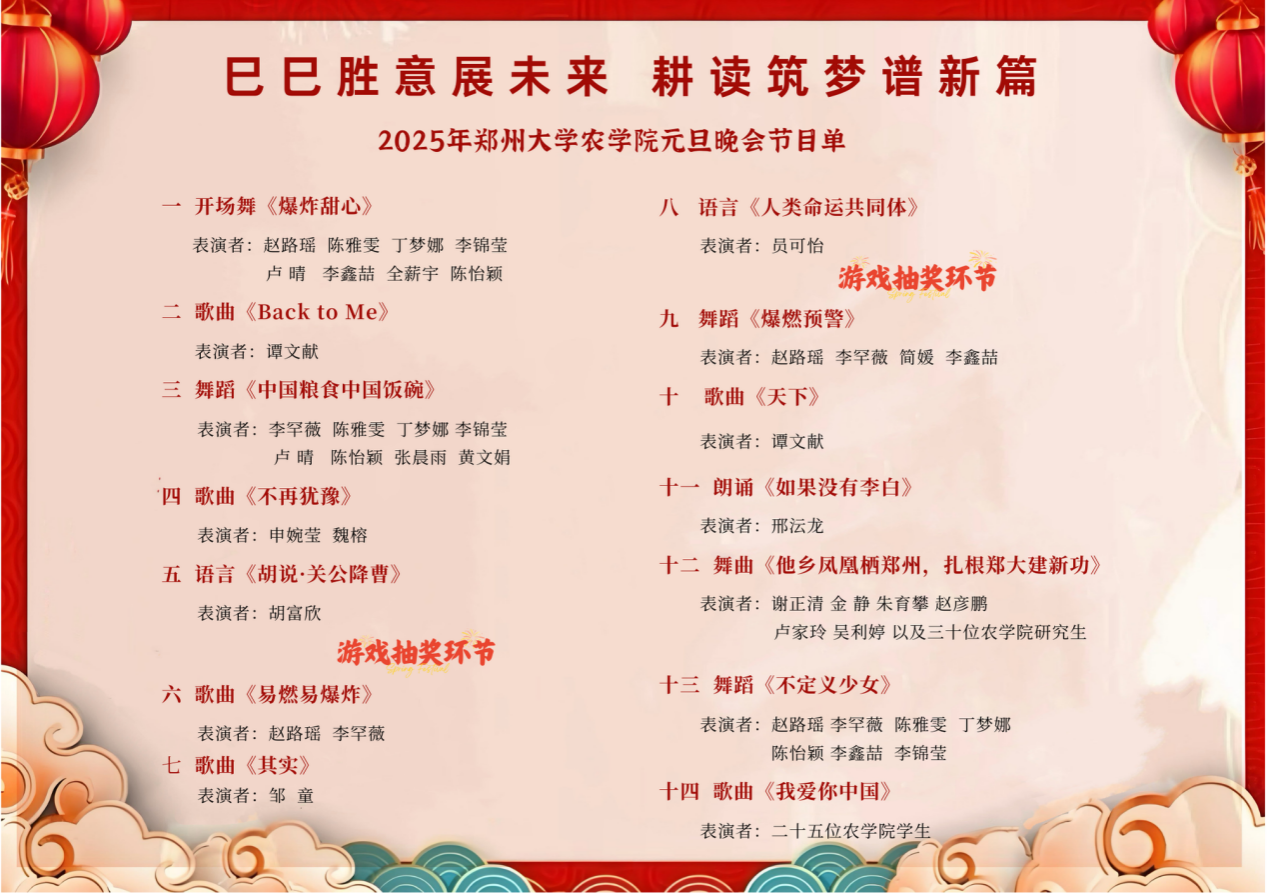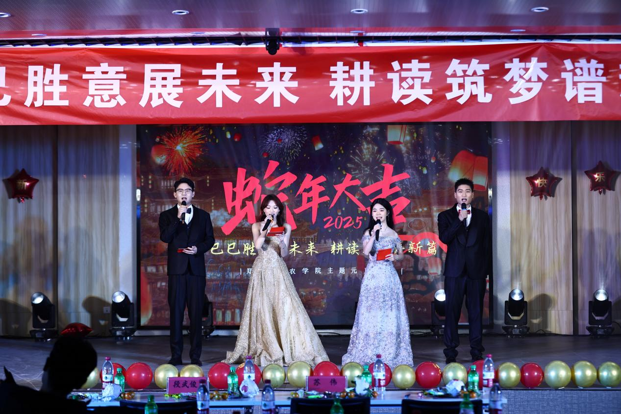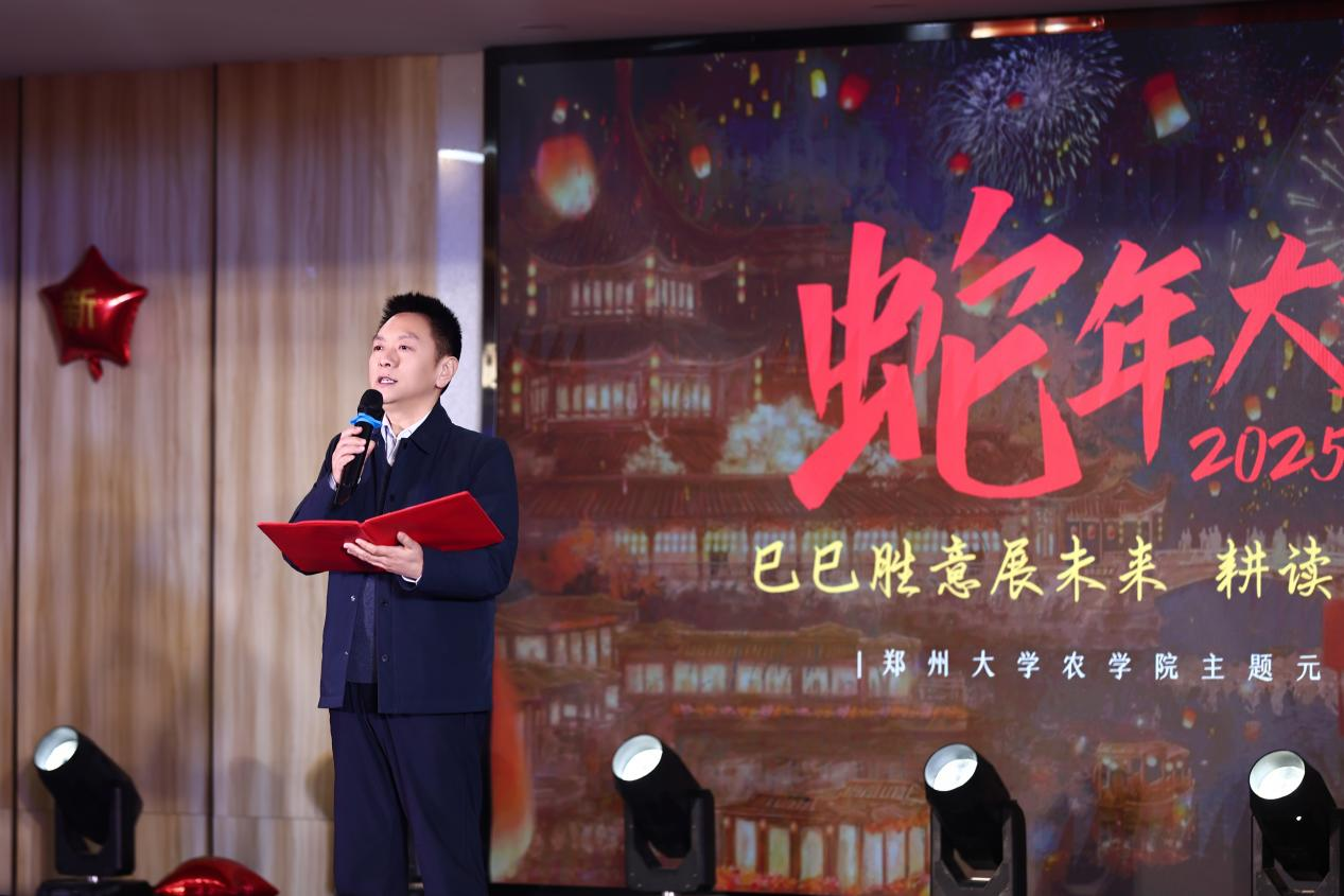 祥龙辞岁留福瑞,金蛇起舞迎新春。在时光的悄然流转中,我们即将挥别满载收获的旧岁,迎来充满希望的新年。2024年12月26日晚,华灯初上,夜色温柔,在这辞旧迎新的美好时刻,郑州大学农学院近三百位师生欢聚一堂,共同庆祝了这场温馨而热烈的元旦晚会,一同开启新年的欢乐序章。全体学生心怀感恩,将诚挚融入歌舞,让才情绽于表演,晚会现场热闹非凡,老师学生同台演出,节目精彩纷呈。农学院党委书记苏伟、党委副书记段武俊、学院团委书记冯小杰以及辅导员张亚敏老师、殷湘坤老师和年级教师都拨冗参与。