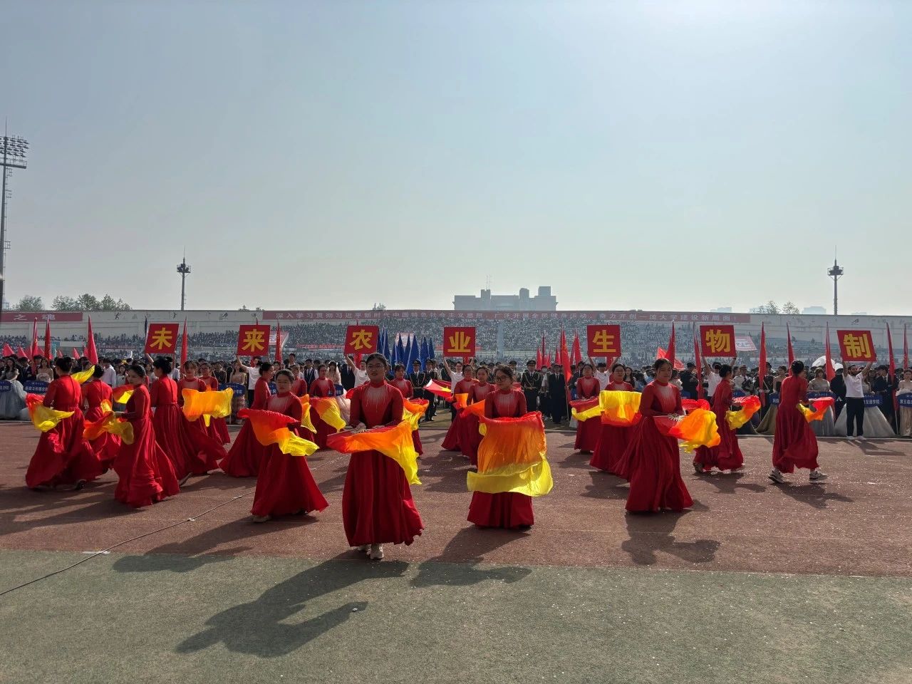 伴随着激昂的运动员进行曲,由农学院师生组成的方阵身着统一的运动服装与红色长裙,举着“未来农业、生物制造”字样的牌子,依次入场。农学院方阵的师生们步伐坚定,口号响亮,他们以饱满的热情和自信的姿态,向在场的观众展示了农学院师生特有的蓬勃朝气。他们的表演不仅体现了农学院师生的团结精神,更彰显了他们对农业科学未来发展的信心和热情。方阵的精彩表演赢得了在场观众的阵阵掌声和喝彩。