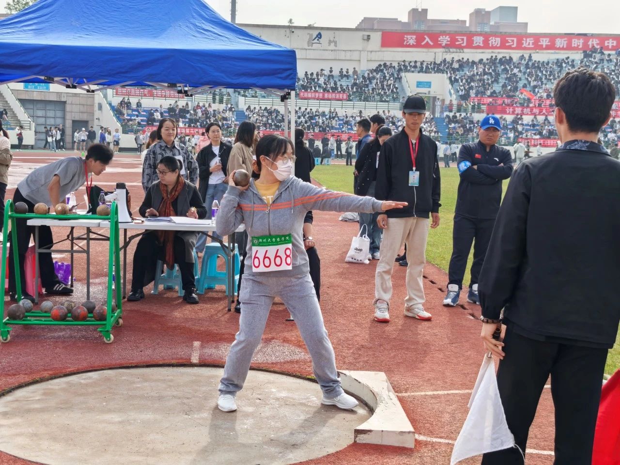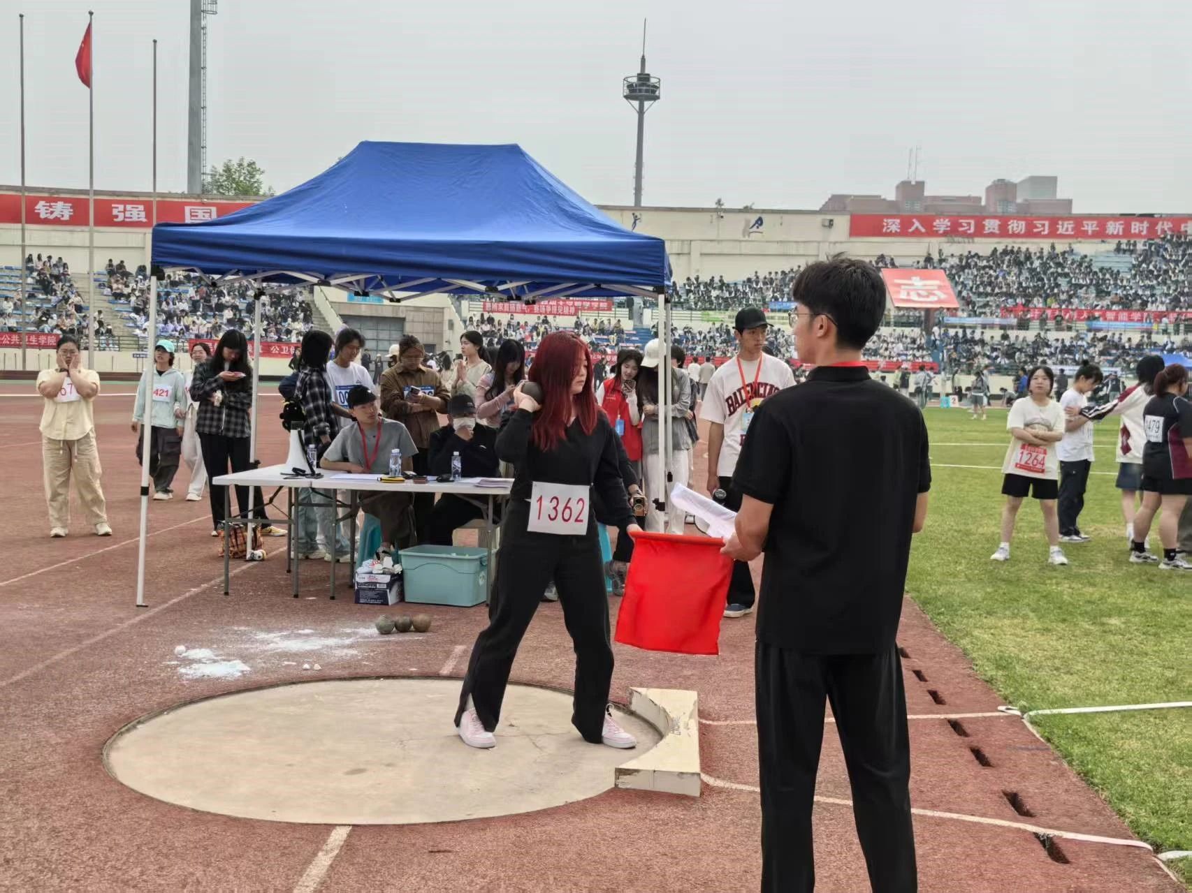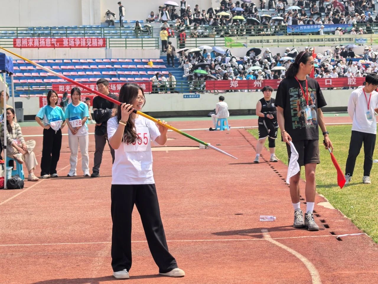 田赛:赤日高悬,标枪场地中,农学院选手笔挺站立,手持标枪。她眼神专注,快速转体、挥臂,标枪似利箭冲向远方,在空中划出优美弧线。