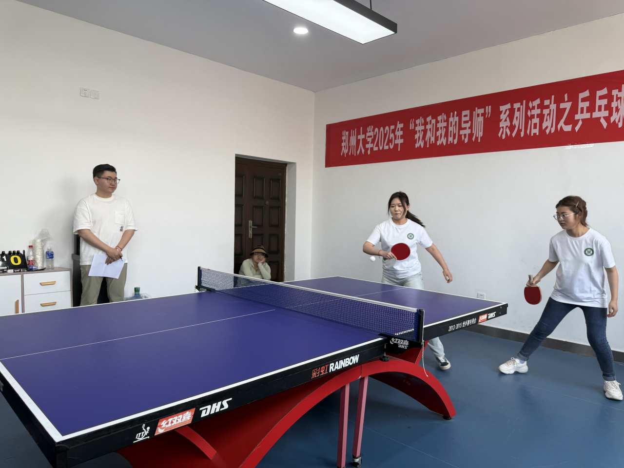 首先拉开战幕的是男双比赛,赛场上的老师和学生恰似并肩作战、默契无间的亲密战友。进攻之际,他们凌厉的扣杀仿若疾风骤雨,来势汹汹,乒乓球在球台上极速弹跳,清脆而急促的撞击声接连响起,令对手防不胜防;防守之时,巧妙精准的回球犹如坚固的壁垒,滴水不漏,将对手一次次极具威胁的进攻成功化解。选手们的目光如鹰隼般紧紧锁定着那小小的乒乓球,身体也随着球的轨迹灵动地闪转腾挪,每一次挥拍都饱含着力量与自信,尽显竞技风采。
