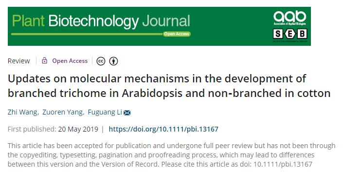 5月20日,国际权威植物学术期刊Plant Biotechnology Journal(IF=6.305)在线发表了农学院院长李付广研究员题为“Updates on molecular mechanisms in the development of branched trichome in Arabidopsis and non-branched in cotton”的综述文章。文章首次系统讨论了模式植物拟南芥表皮毛和棉花纤维发育中的相关研究进展,从关键转录因子、植物激素、表观遗传调控三个方面详细论述了表皮毛发育的分子调控机理,系统比较了拟南芥表皮毛和棉纤维发育过程中分子调控及功能分化的可能原因和机制。