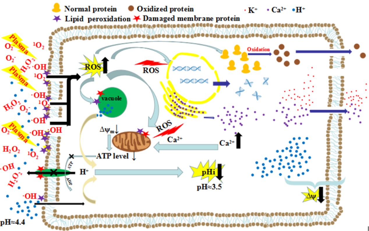 等离子体是除固态、液态以及气态以外的物质第四种状态,是由电子、离子、自由基、激发态粒子等组成的整体为电中性的导电流体。大气压低温等离子体技术是一种在常温常压下能使气体发生电离的新兴等离子体技术,这极大拓宽了等离子体在生物及农业领域的应用范围。大气压低温等离子体杀菌是目前国际研究热点,但是由于等离子体成分复杂,其中活性氧ROS种类众多,如羟基自由基(OH)、单线态氧(1O2)、超氧阴离子(O2-)、过氧化氢(H2O2)等,其杀菌机制仍处于探讨中。焦浈教授团队经过长期摸索,选择出合适的活性氧捕捉剂,对等离子体处理过程中产生的主要ROS成分进行了解析;以真菌模式生物酵母细胞为处理对象,分析各种ROS对酵母细胞的作用特点,初步阐明了大气压低温等离子体诱发酵母失活的亚细胞机制;同时发现低温等离子体能诱发众多细胞结构以及生理活动变化,其中羟基自由基和单线态氧在杀灭细胞中起到主要作用。该研究成果为研究低温等离子体在主要农作物真菌病害防控方面奠定了良好的基础。