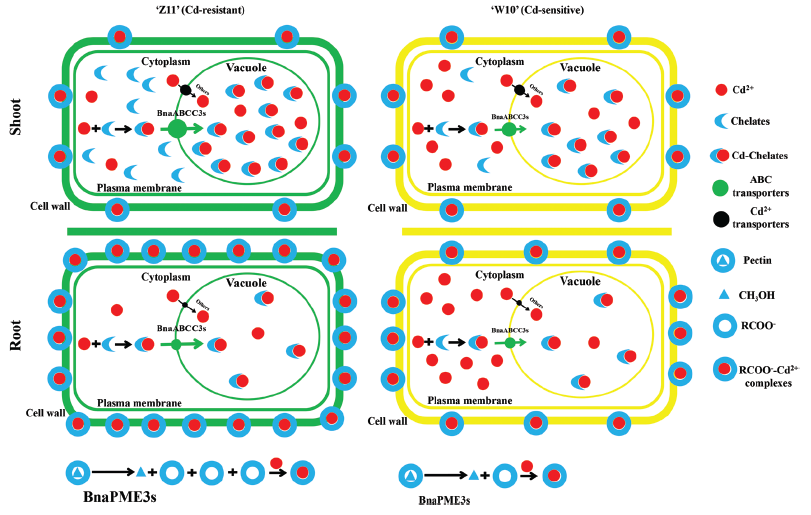 油菜是我国第一大国产植物类食用油来源。然而,各类土壤养分逆境(必需养分缺乏、重金属污染、盐碱胁迫等)严重限制了油菜产量的提高和品质的改良。在我国的重金属土壤污染中,镉(Cd)污染是危害性最大的。油菜具有较大的植株生物量,同时具有较强的镉吸收和耐受能力,是实现植物修复土壤镉污染的重要潜力作物。植物遗传资源研究与利用团队通过筛选油菜自然群体中的镉耐受和镉敏感基因型,利用离子组、基因组、转录组以及代谢组等手段鉴定出以ABC转运蛋白和果胶甲基酯化酶PME为代表的核心基因资源在镉的液泡区室化和细胞壁阻隔发挥重要作用。该项研究成果以A multiomics approach reveals the pivotal role of subcellular reallocation in determining rapeseed resistance to cadmium toxicity为题发表在中科院Top期刊Journal of Experimental Botany杂志上。