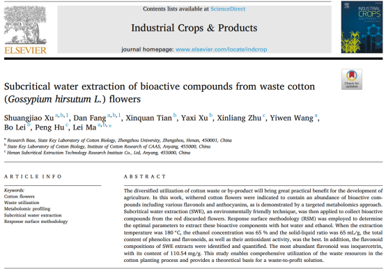 近日,我院马磊研究团队相关研究成果以论文《Subcritical water extraction of bioactive compounds from waste cotton (Gossypium hirsutum L.) flowers》发表在农林科学领域一区Top期刊《工业作物和产品(Industrial Crops and Products)》上。