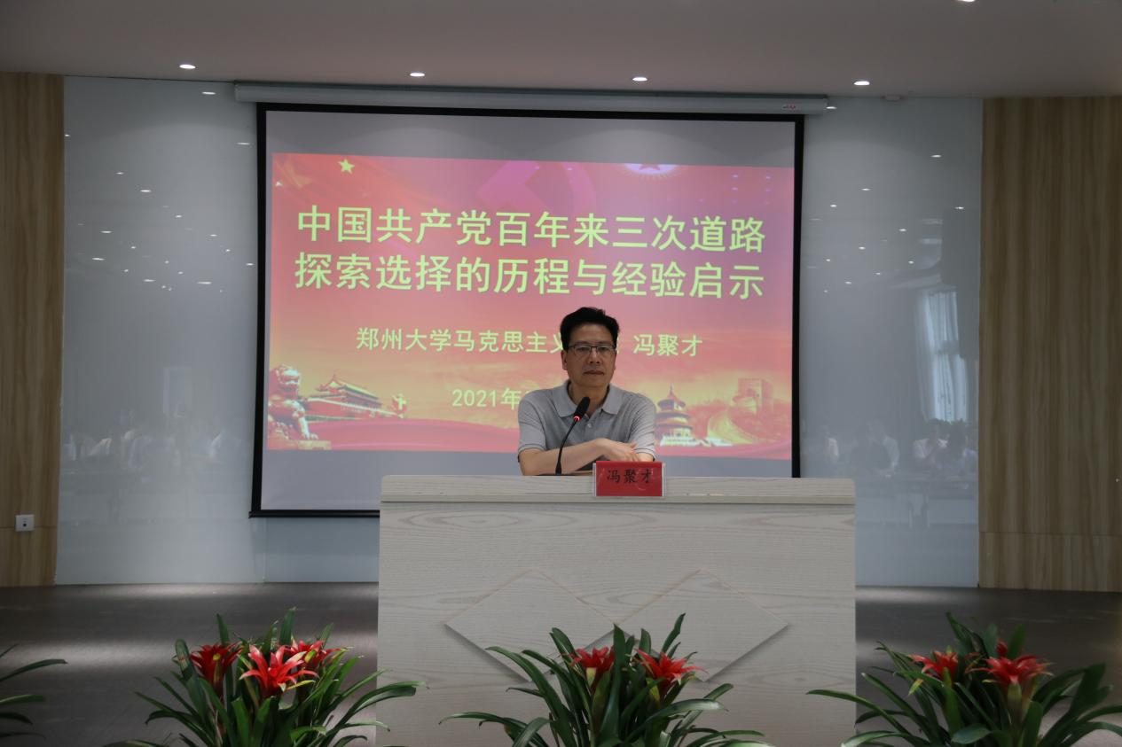报告会上,冯聚才教授围绕“党在道路探索选择中成长、成熟和强大”、“党三次道路选择的伟大历程”、“党探索选择道路的经验启示”三个方面以举例子、讲故事、列数据、作对比的方法,给大家讲授了一段真实、苦难的党史。通过讲授这段历史,也给大家总结了四点历史启示:一是要坚持把马克思主义基本原理同中国实际相结合,不断进行理论创新;二是不断坚持完善和加强党的统一领导,加强党的自身建设;三是要毫不动摇地坚持群众路线,坚持人民为中心,坚持人民至上;四是要坚定道路自信。