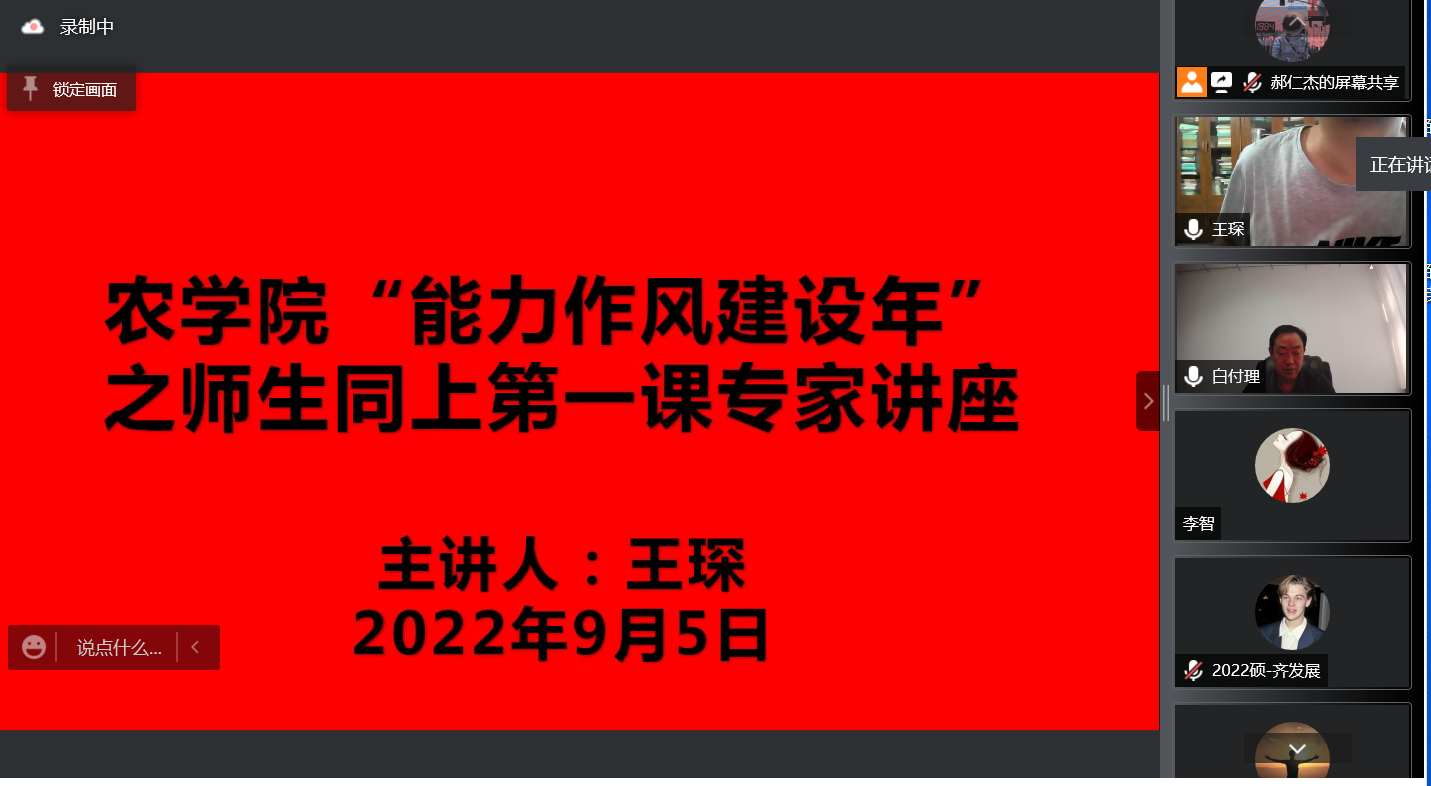 新学期伊始,为了给2022级新生一个良好的开端,引导学生树立正确的价值取向和坚定的理想信念。按照学校党委和能力作风建设年的相关要求,9月5日,农学院以腾讯会议的形式,在线举办“能力作风建设年”之师生同上第一课专家讲座。本次讲座邀请教育部高校思想政治工作队伍培训中心办公室主任、郑州大学马克思主义学院教授、博士生导师王琛教授做专题讲座。农学院全体教职工和2022级新生在线参加讲座。讲座由农学院党总支书记白付理主持。