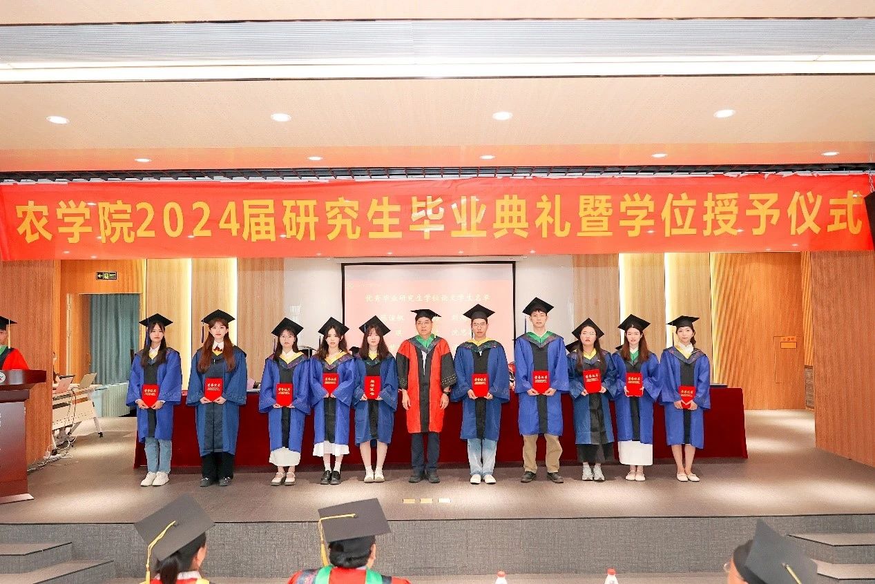 副院长位芳宣读 2024 年省级、校级优秀毕业研究生名单,优秀毕业研究生学位论文学生名单,农学院三好学生、优秀学生干部毕业生名单。党委书记苏伟、院长李付广和执行院长焦浈分别为学生颁奖。