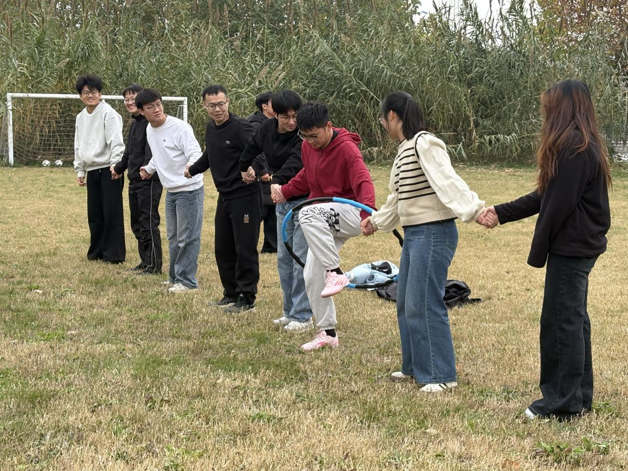 “一圈到底”比赛要求团队成员手拉手,在全程不松手的前提下,将呼啦圈从队伍排头依次钻越传递至排尾。队员们灵活钻越、默契配合,活动现场充满了欢声笑语。
