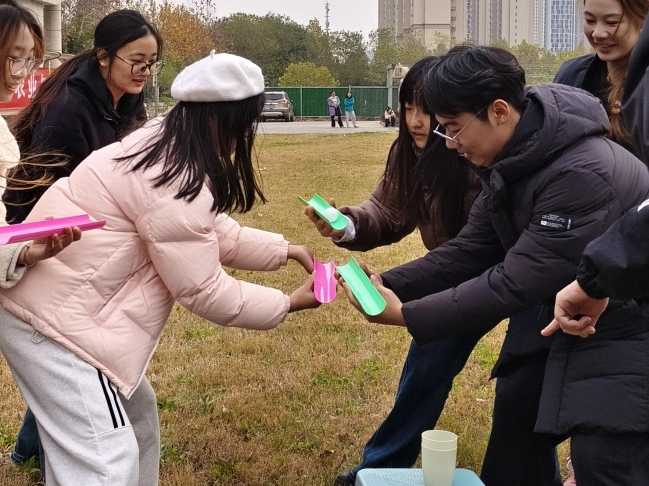 “球行万里”比赛中8人一组,团队成员配合默契,让乒乓球顺着凹槽稳稳传递,当排球成功落入终点的纸杯中,队员们击掌拥抱,脸上洋溢着兴奋的笑容。