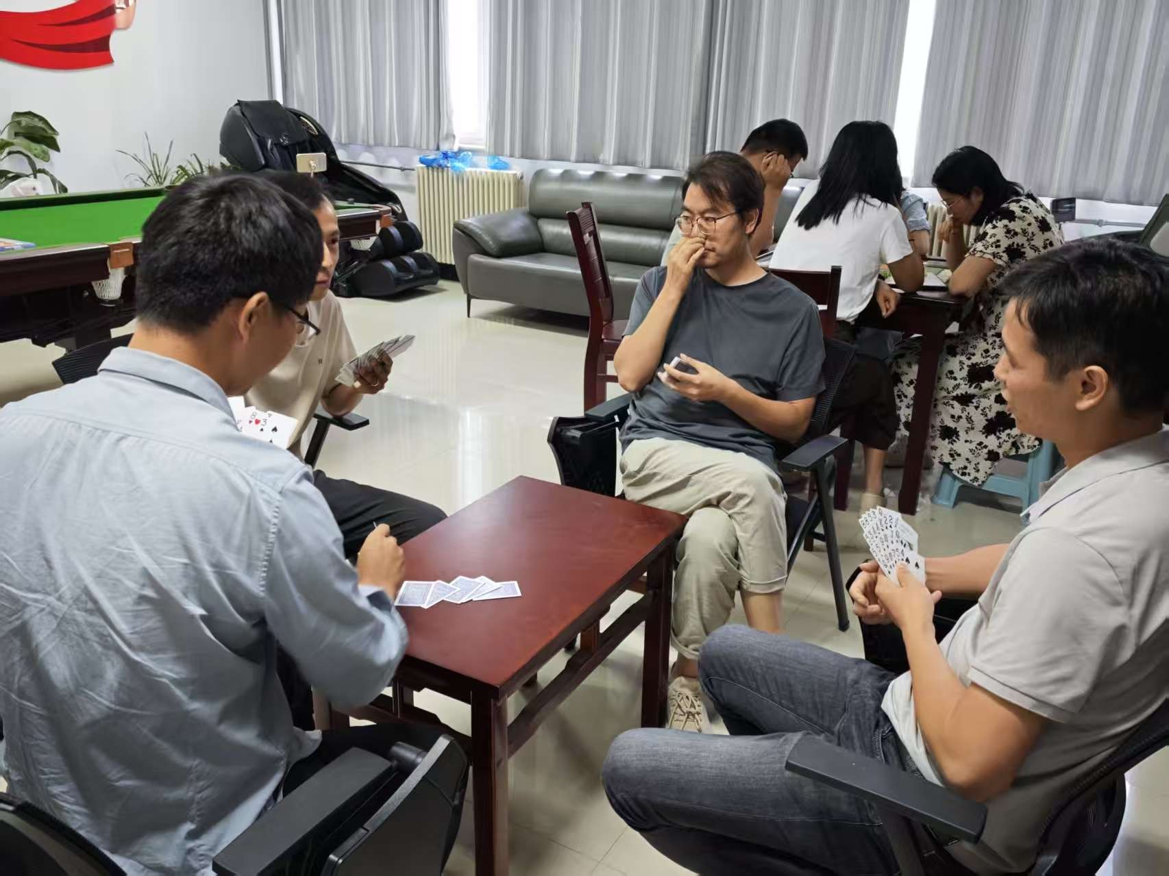 跳棋赛场汇聚了来自不同教研室的5名选手。比赛采用单循环积分制,参赛者需在有限步数内规划最优路径,既需防范对手围堵,又要巧借棋子搭桥。赛场上,选手们时而凝神沉思,时而果断落子,棋盘上跳跃的彩色棋子如同思维碰撞的火花。其中,冯小杰和杨琼两位老师作为去年参加过一次比赛的老队员也积极分享自己的战术心得;双升比赛以两两组合形式展开,8名教职工组成4支队伍展开智力博弈。比赛中,搭档间既要压制对手又要把握出牌时机。赛况跌宕起伏,既有“主牌定乾坤”的果断出击,也有“跟牌巧解围”的默契配合。其中,由李军、李刚岭组成的“双李”组合凭借对规则的深刻理解与临场应变能力,一度两次跳级升级,打出了精彩的出牌策略。