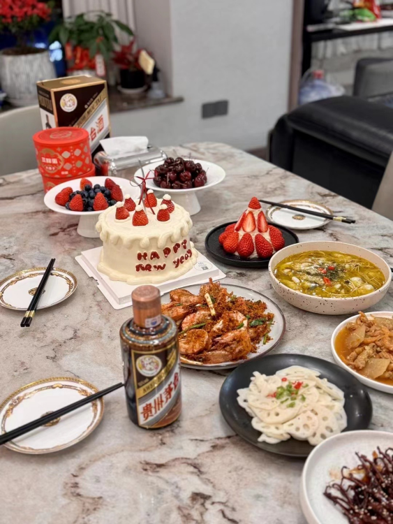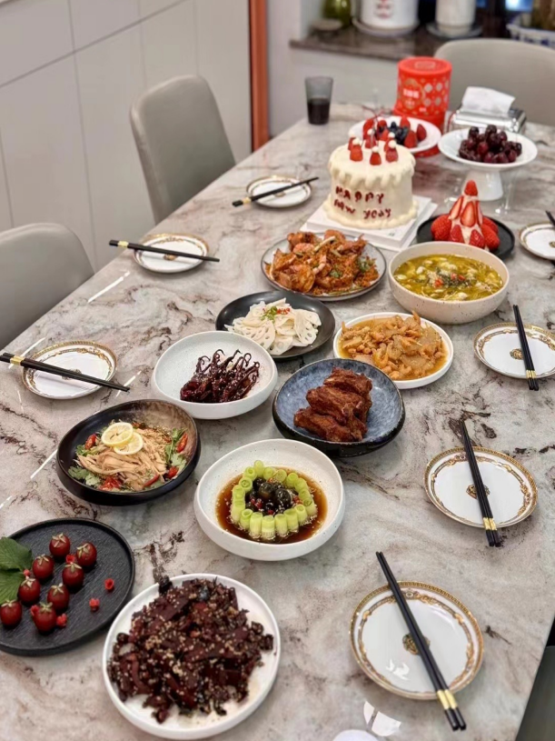 年夜降至,家中餐桌热闹非凡。佳肴丰盛,有鲜嫩凉拌菜、香浓热汤与诱人主菜。蛋糕上 “Happy New year” 字样洋溢喜庆。美酒庄重摆好,象征团圆与美好祝愿。一家人围坐,笑语盈盈,夹菜碰杯,在美食与亲情中,共度温馨时刻,开启新岁篇章。