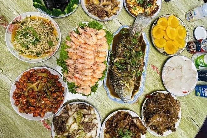 满桌佳肴尽显团圆氛围。桌上有寓意“大吉大利”的鸡肉,象征“年年有余”的鱼菜,还有各类荤素搭配的炒菜、炖菜。热气腾腾的锅仔,散发着浓郁香气,各色菜品丰富多样,也彰显着家乡的风俗——年夜饭要有腊味和火锅!一家人围坐,共享这顿丰盛年夜饭,在美食中感受新春的喜悦与家的温暖。