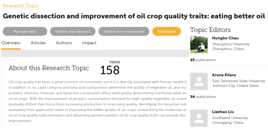 / 2022-04农学院青年教师朝红波博士应国际知名期刊Frontiers in Plant Science编辑邀请担任该期刊客座编辑,组织编写新一期“油料作物”特刊,Research Topic题为“Genetic dissection and improvement of oil crop quality traits: eating better oil”。Frontiers in Plant Science 期刊是聚焦于植物学领域的前沿开放获取期刊,创刊于2010年,文章总引用次数在植物类排名全球第一,在植物学类期刊中处于领先地位。该期特刊聚焦于解析油...