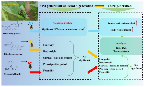 / 2023-05近日,郑州大学农学院崔金杰研究员团队开展了非杀虫农药对捕食性天敌龟纹瓢虫多代胁迫风险评估研究,首次发现除草剂精喹禾灵的多代胁迫可以提高龟纹瓢虫的成活率,而甲基硫菌灵和缩节胺对龟纹瓢虫生长发育没有显著影响。该研究为棉田合理施用农药提供了科学依据。相关研究结果于2023年5月10日以“Risk assessment of predatory lady beetle Propylea japonica 's multi-generational exposure to three non-insecticidal agroc...